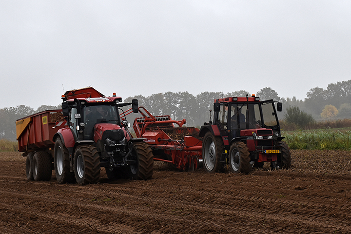 Een Case International 845 XL Plus met Grimme DL 1500 wagenrooier en Case IH Maxxum 145 met Bijlsma Hercules 1400 kipper.
