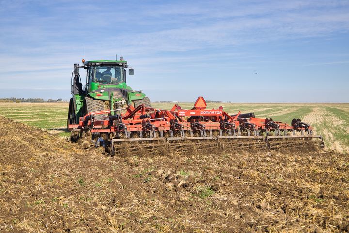 Op een ander perceel was deze John Deere 9620RX met Kuhn Dominator schijveneg het land aan het bewerken.