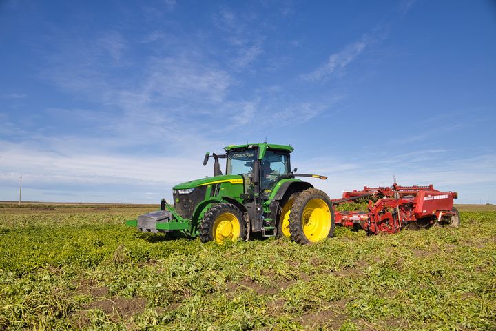 Een John Deere 8370R met Dirty Digger rooier en daarnaast een John Deere 8370RT met Spudnik 4835 Crop Cart.