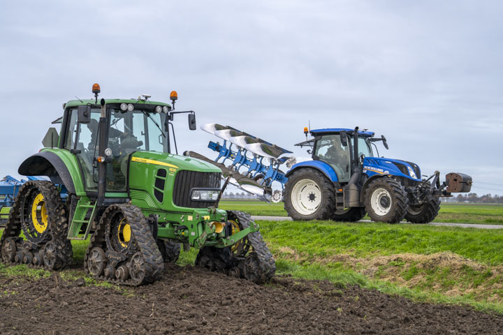 JD 6830, eveneens op Soucy tracks, met Lemken Kompaktor.