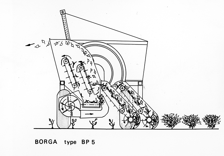 In Nederland zijn thans 50 rijenplukkers voor stamslabonen actief. Het IMAG doet onderzoek naar breedplukkers of rijenplukkers. Hier de Borga 4-rijïge rijenplukker met een extra zuig-schoning.