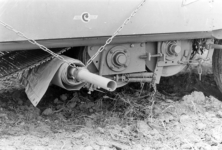 Sterbo rooimachine met verzamelbak. Zowel bij dit syteem als bij het kneuzen moet het systeem zo dicht mogelijk zijn.
