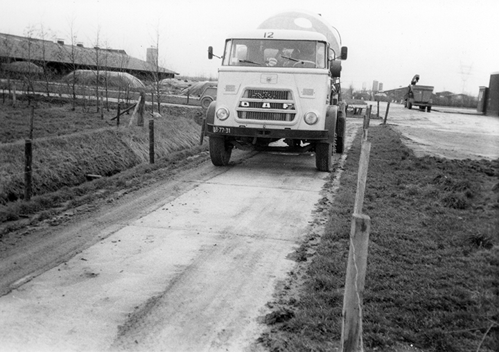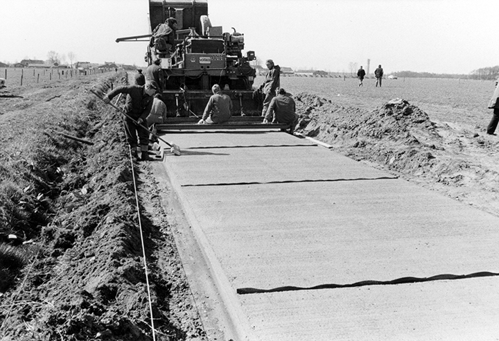 Machinale aanleg van een betonweg op een melkveebedrijf in Noord-Beveland.