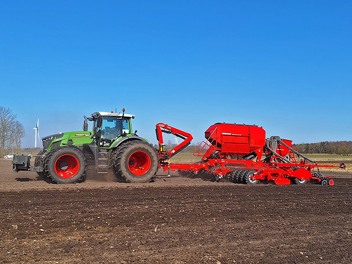 Fendt 942 Vario met Horsch Pronto 8 DC van het Deense loonbedrijf Skamstrup uit Varde.