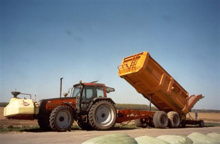 NH TL 100 met een Cramer aardappelpoter en een NH TL 100 met Bav? tandemas kipper en Samon onderlosser.