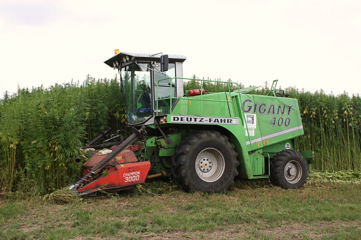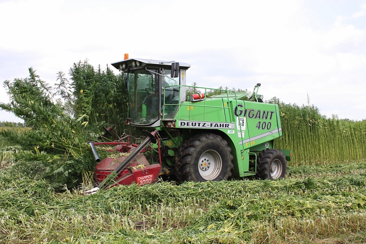 Vezelhennep maaien met een Deutz-Fahr Gigant 400 hakselaar met Kemper Champion 3000 bek. De hakselaars, van HempFlax uit Oude Pekela zijn omgebouwd tot zwadmaaiers.