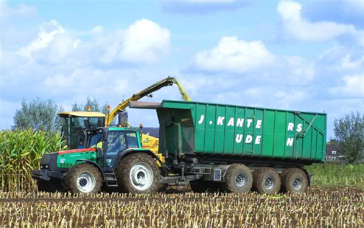 Loonbedrijf Kanters uit Uden en Koenen uit Erp hakselen samen maïs. Daarvoor worden een New Holland 8870A met Kurstjens Carrier, Valtra T met Vaia kipper en een tweede oude Valtra met 3 assige carrier ingezet tesamen met een New Holland FX 58 met RI 600 bek.