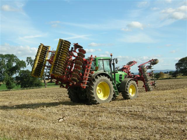 JD 7430 met Kongskilde Front Terra Disc, Pöttinger Terradisc 4000 en Hatzenbichler Opico Variocast voor het cultiveren van de stoppel en zaaien van koolzaad in één werkgang.
