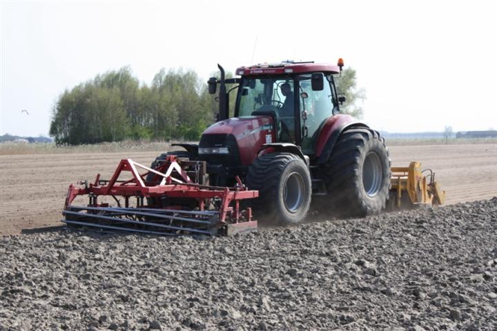 Case International Maxxum 125 met een Steketee zaaibedcombinatie en baselier hakenfrees van Oosthoek uit Zevenbergen. Hier worden wortelruggen gefreesd die deze week worden gezaaid.