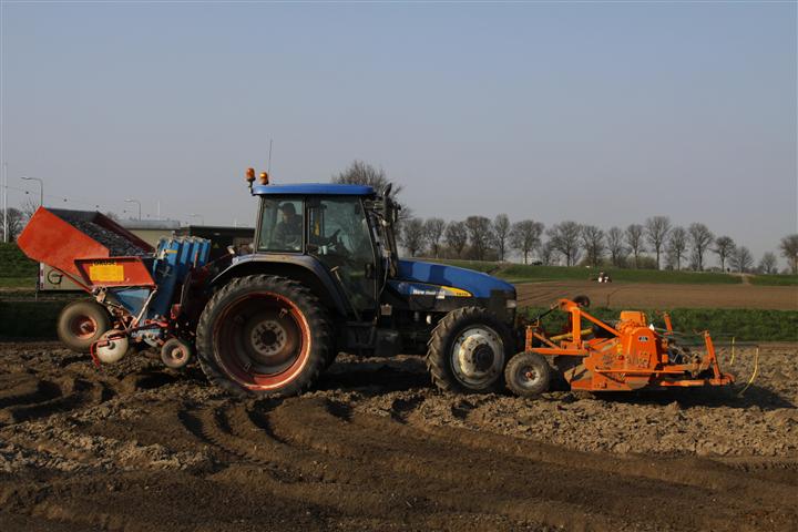 New Holland TM 155 met Struik frontfrees en Gruse VL 20 KLS aardappelpoter van akkerbouw- en loonbedrijf Gebr. van der Hoek uit Heinenoord.