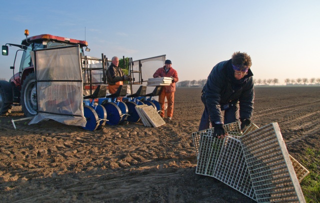 Na het zaaien van de bieten en uien gaan ook de spruiten alweer in de grond. De oude oogst is nog maar net weggewerkt of de boeren zijn alweer druk bezig met oogst 2010. Bij een oude bekende, Leen van de Polder, fotografeerde Chris op een koude ochtend het planten.