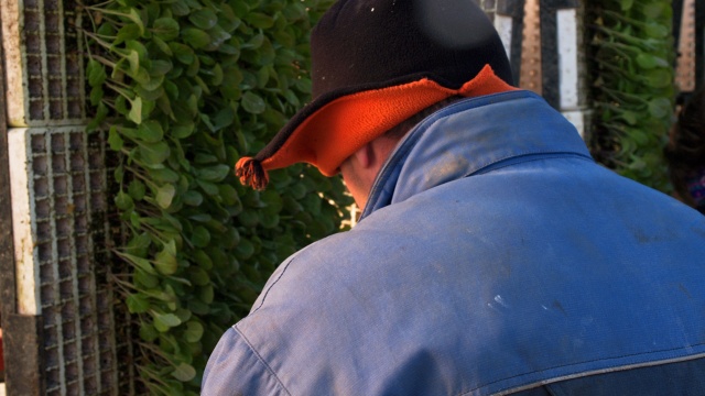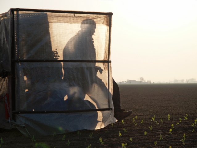 Een paar dagen voordat Leen met het poten van zijn spruitenplanten zou beginnen belde hij mij op. We hadden afgesproken dat ik bij die eerste plantjes aanwezig zou zijn om de hele cyclus van de spruitte kunnen volgen. Een straffe noordooster maakte het toch aardig koud, die vroege ochtend in de Sint Annapolderin Rockanje. Maar het licht was prima en de sfeer uitstekend. Wat wil je? Wie zit er nou spruiten te plukken vanaf een Ferrari! Een kleine 96.000 plantjes, lichtgroen tegen de zon afstekend, stonden klaar om in de grond gestopt te worden. Langzaam maar zeker begonnen de lijnen zich in het land af te steken. Het heeft wel iets, dat jonge grut in de grond, op weg naar de eerste pluk over een half jaar.