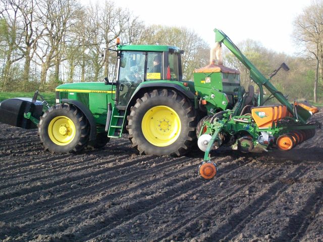 Mais zaaien door loonbedrijf Gebr. Riemsma uit Een met een John Deere 6810 en Amazone ED602-K zaaimachine.