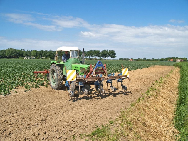 Schoffelen, dag éénLeen van der Polder belde mij dat hij ging schoffelen. Hij weet dat ik vanuit mijn werk niet altijd kan komen fotograferen, dus maakte hij twee mogelijkheden voor me. En bij geluk kon ik zowel de eerste als de tweede dag naar hem toe. De schade aan de spruiten was nog steeds duidelijk te zien, ondanks dat het gewas in een paar weken aardig in blad was gekomen. Het was bijzonder hel (of fel) licht. Dat maakt het fotograferen er allemaal niet makkelijker op. En ondanks die felle zon was een trui geen overbodige luxe. Ik kan toch heel erg genieten van het geluid van zo'n oudere trekker. Het gaat allemaal wat anders en het heeft iets speciaals.