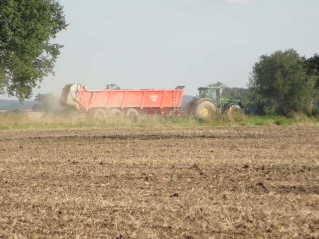 John Deere met een drie assige meststrooier.