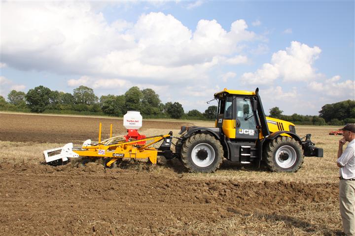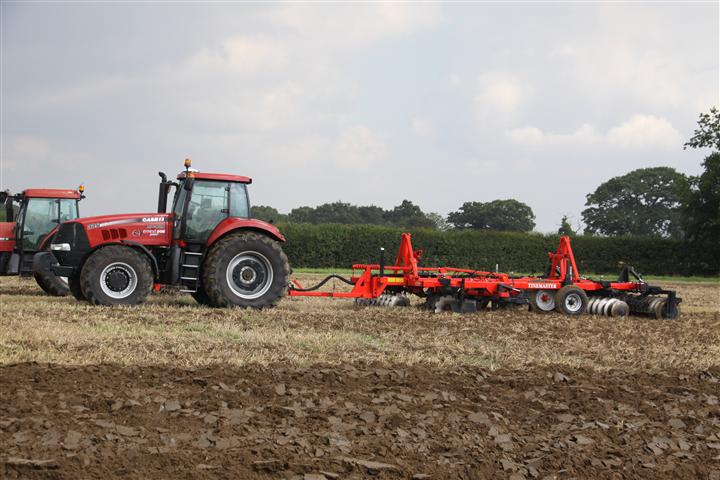 Claas Xerion 3800 Trac met een Philip Watkins Quad-Till Extra cultivator. Voorop de trekker hangt een 3000kg gewicht van Watkins.