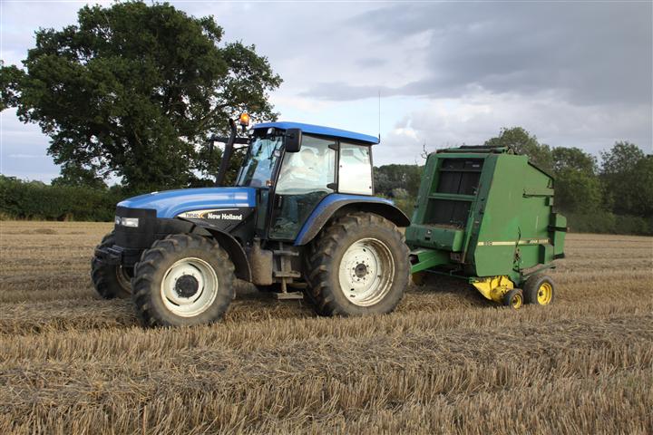 New Holland TM 140 met een John Deere 550 rondebalenpers.