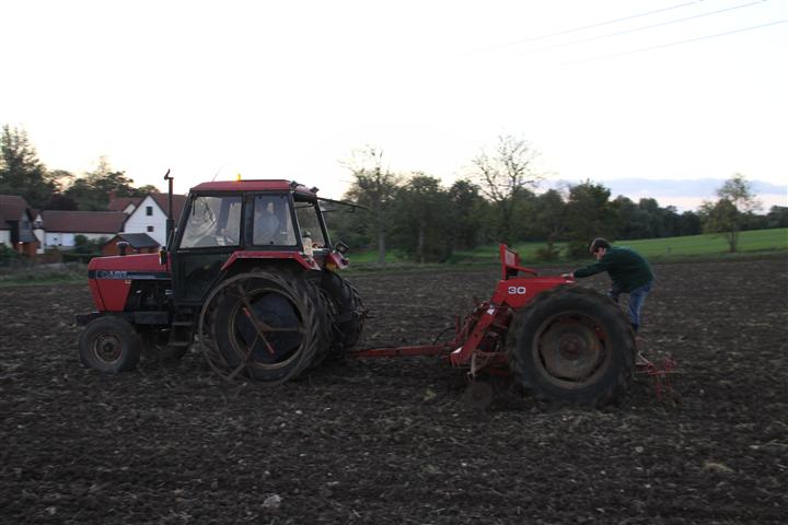 Wintertarwe zaaien door een Case International 1394 met een Massey Ferguson 30 zaaimachine.
