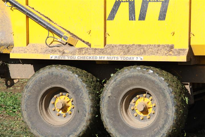 Have you checked my nuts today? Opvallende sticker om chauffeurs erop te doen letten dat ze de wielmoeren regelmatig controleren.