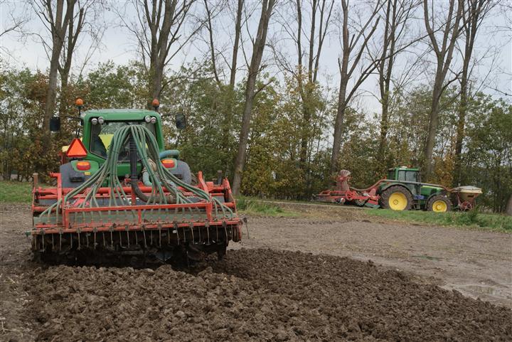 JD 7530 met een Lely Polymat fronttank en Farmax spit-zaaimachine.