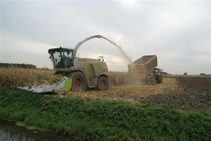 Claas Jaguar 960 hakselaar met Claas Arion. Voor het hakselen van de MKS (Mais kolven Silage) is de hakselaar uitgerust met een Conspeed 8-75 FC bek.