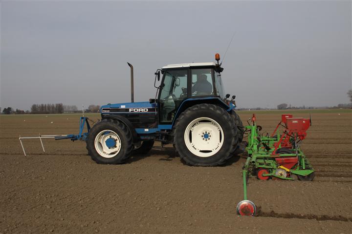 Ford 7840 met een 12 rijige Vicon Monozentra bietenzaaimachine van Ab de Snayer uit Zuidland.