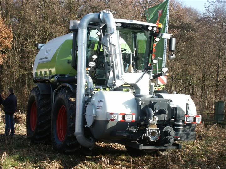 Xerion Saddle Trac met mesttank opbouw van loonbedrijf Oldenhof uit Heerde.