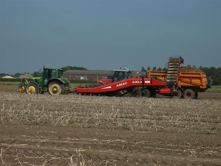 Aardappels rooien met een John Deere 6420 met Amac AXL 2 rooier en Massey Ferguson 6180 met Miedema Prestige 130 kipper.