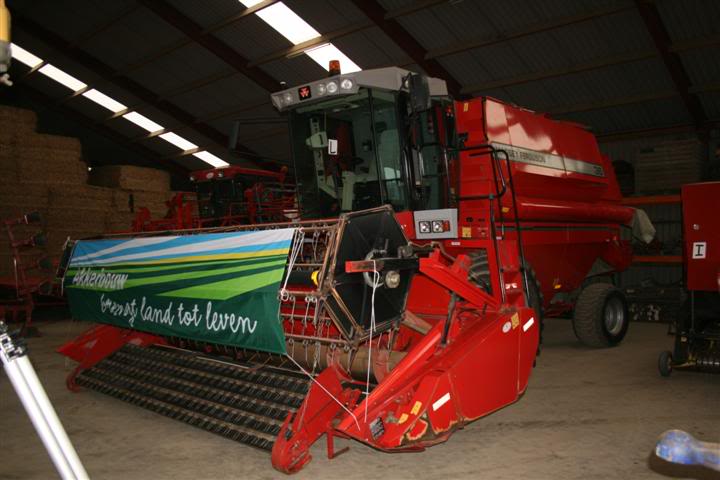 De MF 7495 met 16.5m brede Veenhuis sleepslangbemester wordt nog even snel schoon gespoten.