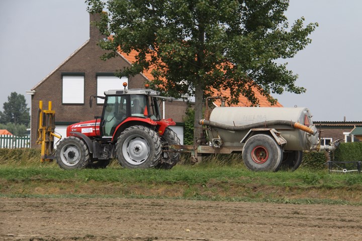 Massey Ferguson 6455 Dynashift met Peecon hefmast en waterwagen van loonbedrijf Den Engelsman uit Poortvliet.