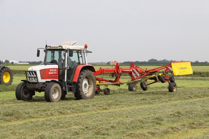Steyr 9078 met een Pöttinger Eurotop 651 A Multitast hark van melkveebedrijf Kolen uit Dinteloord.