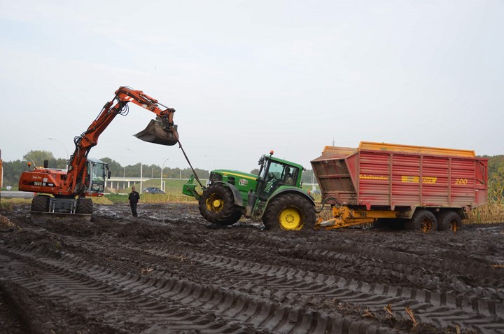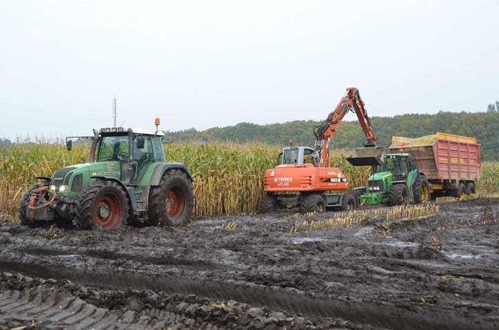 Modderworstelen is eigenlijk de enige juiste benaming voor deze fotoserie. Zo zien we loonbedrijf Van Drunen aan het modderen in de maïs. Ook zien we hoe loon- en akkerbouwbedrijf Van Wijgerden met hun Grimme Tectron probeert nog een perceel aardappelen te redden.