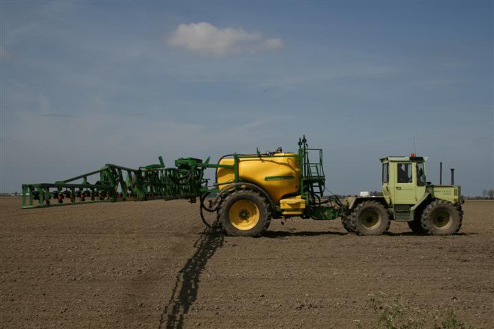MB-Trac 800 met John Deere 840i veldspuit van akkerbouw en loonbedrijf C.A. Nobel uit Oudenhoorn bezig een bespuiting uit te voeren in de suikerbieten.