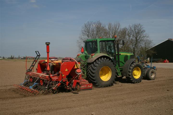 John Deere 6920s met Rabe bandenpakker, Lely kopeg en Turbosem zaaimachine bezig met het zaaien van een perceel erwten.
