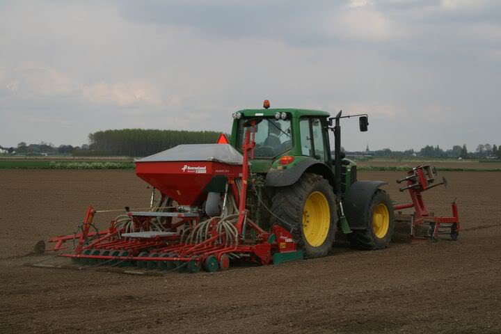 Eerstejaars plantuitjes zaaien door akkerbouwbedrijf Klompe uit Greup. met een John Deere 6830 met voorop een Steketee combirol en Kverneland Accord kopeg en pneumatic DA-S zaaimachine achter.