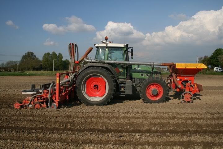 Spruiten planten met een Fendt 411 met voorop een Lely kopeg en 4 rijige spruitenpoter achterop.