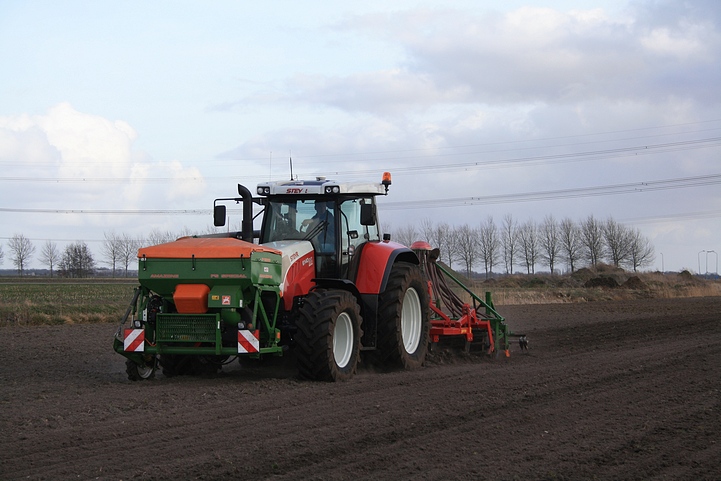 In het begin van het jaar worden veel nieuwe trekkers geleverd. Bij het maken van foto's in het voorjaar kom je dus regelmatig splinternieuw materiaal tegen. Zo ook in deze serie, waarin te zien is hoe in de Veenkoloniën wordt bemest en zomertarwe gezaaid.