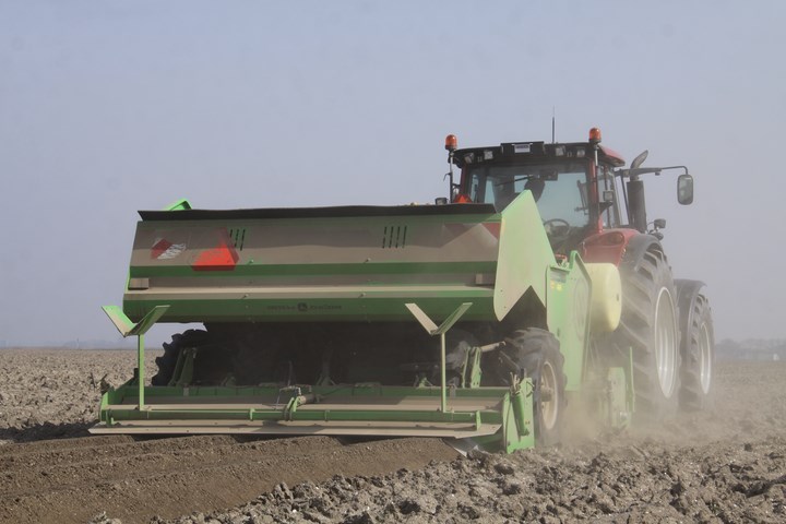New Holland TM 155 met een twaalfrijïge Hassia bietenzaaimachine van akkerbouwbedrijf Ten Cate uit Swifterbant.