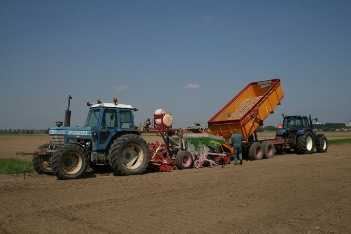Aardappels poten in Stampersgat met deze Ford 6710 met een Lely kopeg en zelf verbouwde Hassia KL 9-4 aardappelpoter tot een getrokken machine.