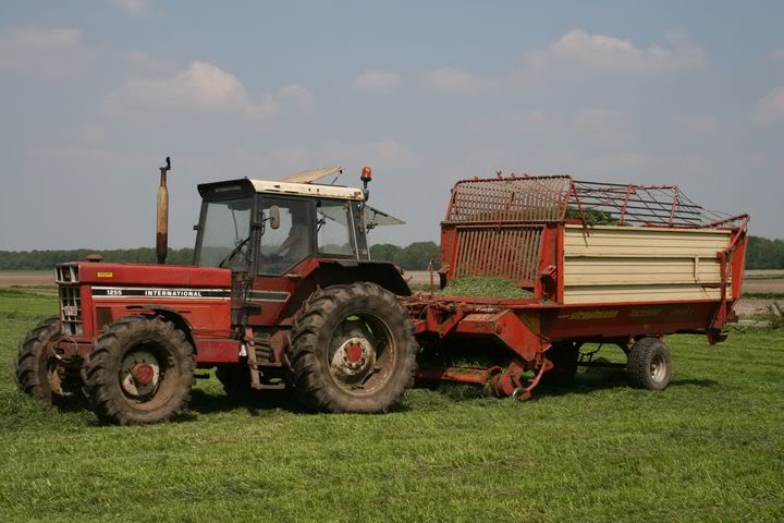 Het gras werd opgeraapt door deze International 1255 met Strautmann Ladeblitz LBF 313 L opraapwagen.