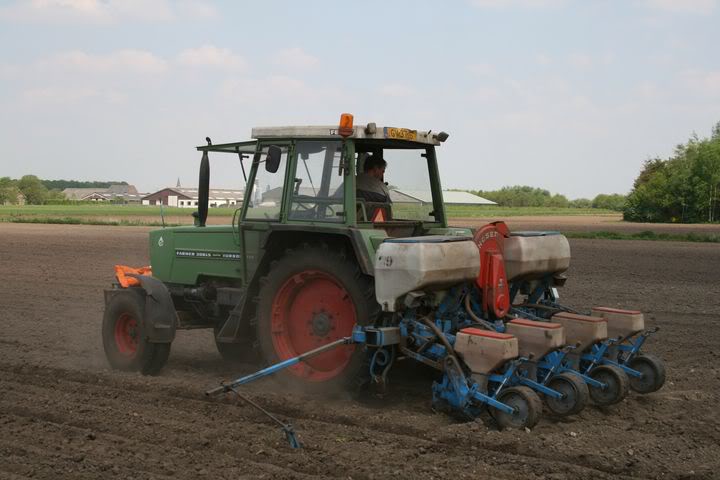 Maïs zaaien in het Belgische Essen met een Fendt Farmer Turbomatik 306LS met 4 rijige Monosem zaaimachine.