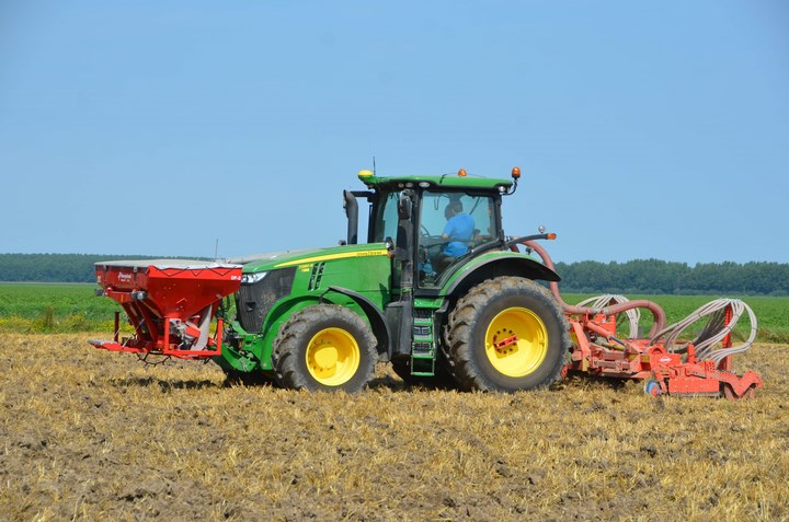 JD 7280R met een Kverneland Accord DF-2 fronttank en 6m Kuhn HR 6003 kopeg.