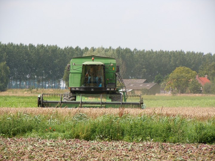 Tarwe combinen door een JD 2066 van akkerbouwbedrijf Van Waes uit Schoondijke.
