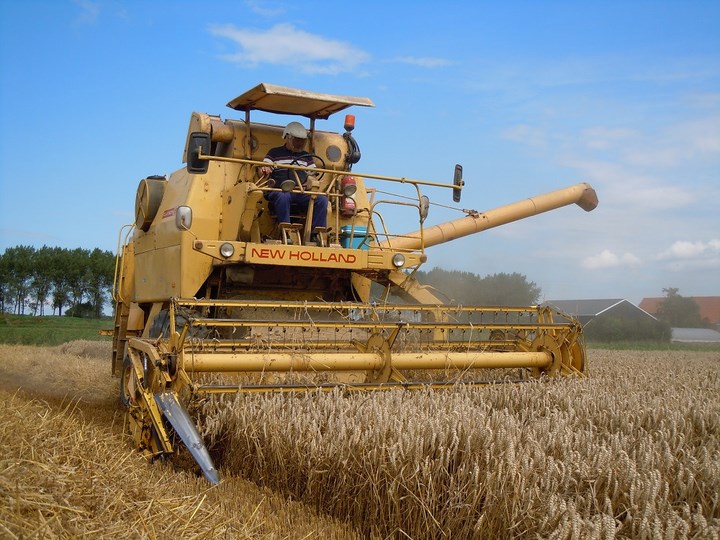 De tarwe wordt hier geoogst door een NH Clayson 1545 combine. Inclusief het originele zonnedak.