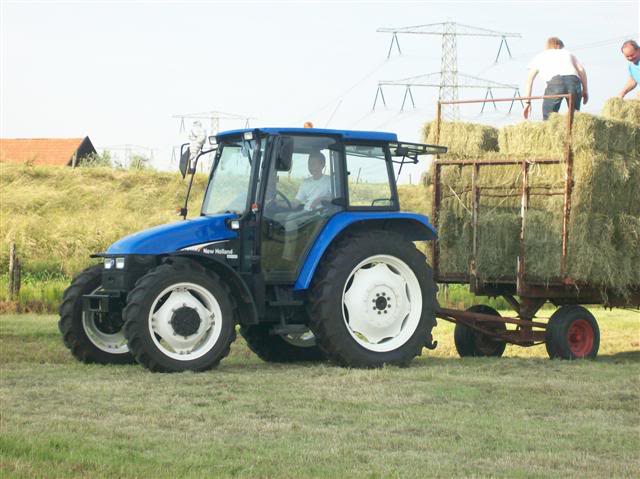 New Holland TL 100 met platte wagen en Ford 3940 met voorlader en balenklem.