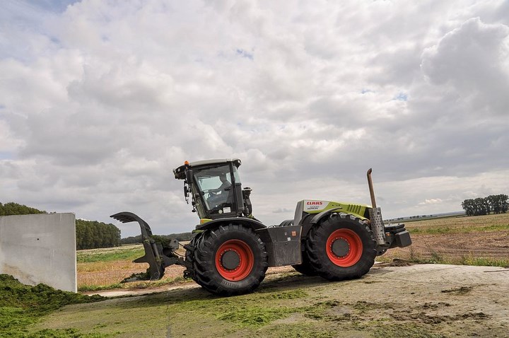 Op de kuil een Claas Xerion 5000 Trac VC met silage vork.