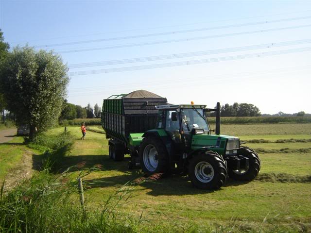 Deutz Fahr Agrostar met Deutz Fahr K 7.44 opraapwagen.