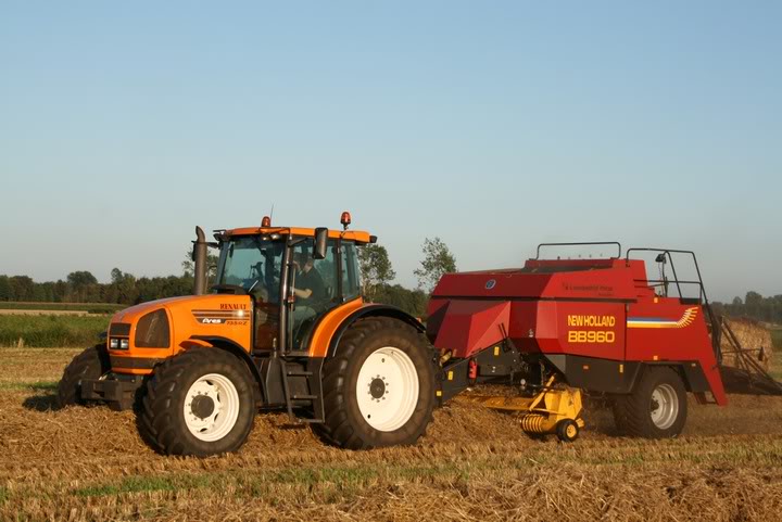 Loonbedrijf Potze uit Roswinkel aan het stro persen met een Renault Ares 735rz en New Holland BB 960 grootpakpers. De trekker wordt gehuurd van dealer Robertus uit het Tweede Exloërmond.