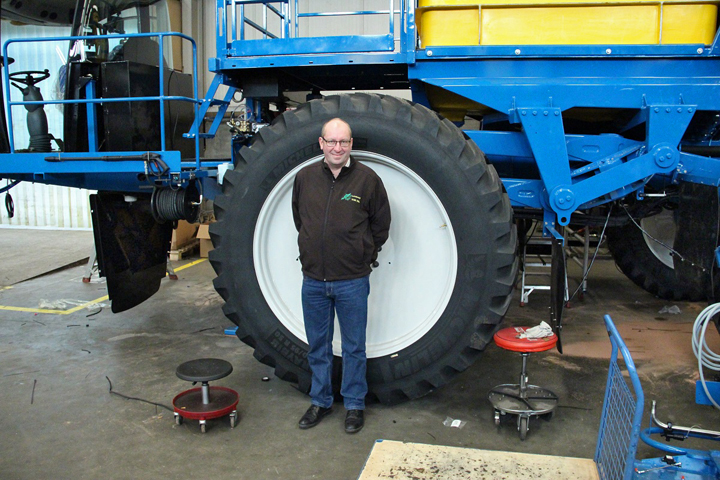 Kees' vriend Hanny voor een 50 inch wiel. Deze spuit is voor een Nederlandse klant bestemt. De spoorbreedte kan tussen 2.20 en 3.20m versteld worden. Delvano noemt dat Wide Spread. De boombreedte bedraagt - echt Nederlands - 50 meter.