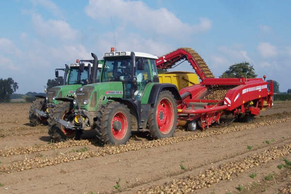 Uien laden met een Fendt 718 met Grimme GT 170-S lader en Fendt 715 met een Gull kieper.